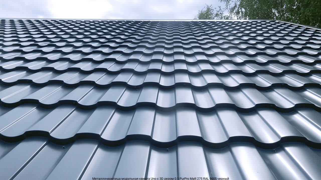 Металлочерепица модульная квинта Uno c 3D резом 0.5 PurPro Matt 275 RAL 9005 черный купить в Москве оптом и в розницу предлагает интернет-магазин «Ле-Металл». Низкие цены за метр